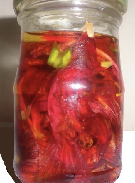 Once the oil is cooled ,take about 6 hibiscus flowers and 3 hibiscus leaves and soak it in the oil.