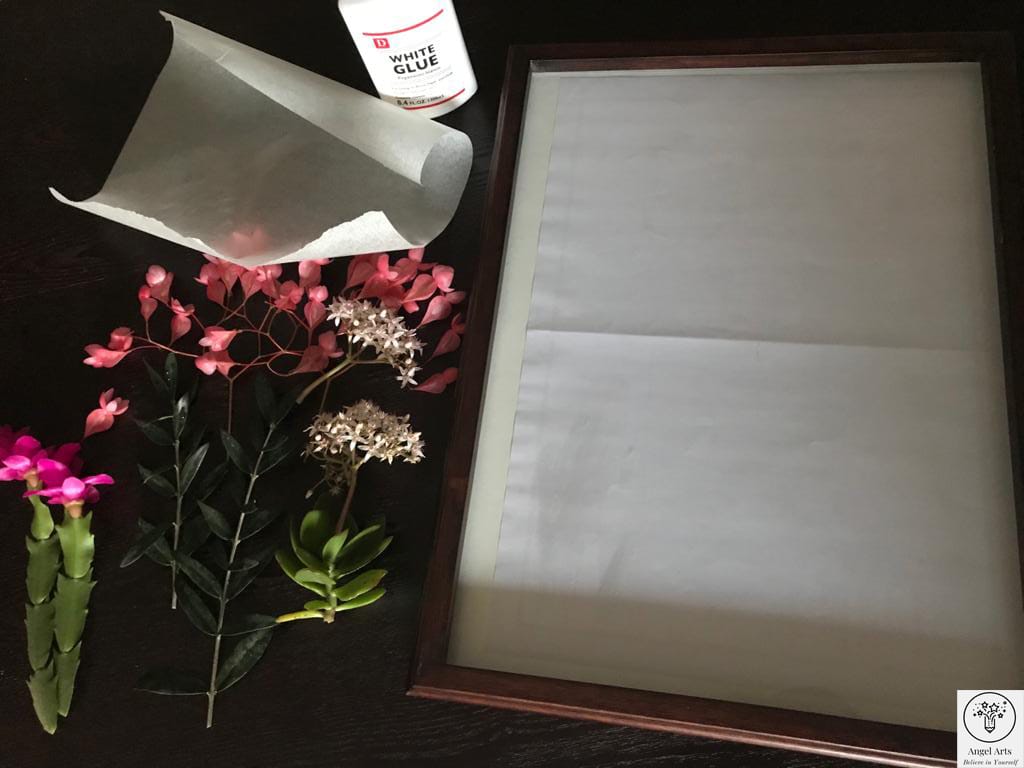 Collect your favourite flowers from your garden. You can press flowers in a book, and leave it for one week. As the flower is pressed, it will dry out, causing moisture to be absorbed. You can use dense books on the top of the book to press your flowers. Once they look ready, you can arrange them on the cardboard .You can use elmers white glue to stick the flowers before they are to be framed.